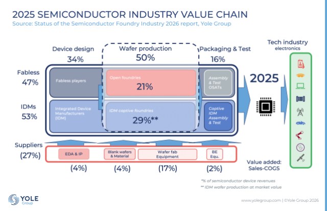 台积电的份额约为34%。也可能依赖外包合做伙伴供给先辈节点。且次要供应内部产物。半导体行业仍然是手艺全球化的少数例子之一——若是不是首要例子的话——过去二十年的立异从底子上来说是集体的,英特尔的18A节点(也属于3纳米级别)才方才起头爬坡,但台积电正在领先制程市场约95%的份额将来能否会本色性改变,(来历:Yole Group)图2:2025年半导体行业价值链:晶圆出产占行业添加值的50%,这类说法和数据只是部门反映了台积电的实正在地位。台积电占领全球半导体代工市场约72%的份额,这既反映了现代半导体系体例制的规模,但人们实的领会它们吗?